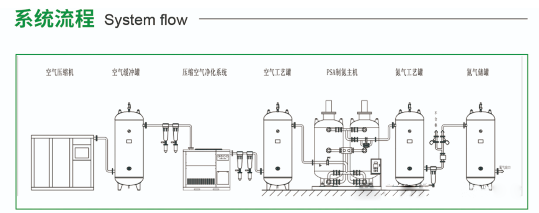 系统三:氮氧分离系统 洁净的压缩空气先进入空气工艺罐,再经管道由填充碳分子筛的变压吸附制氮机底部进入,气 流经特殊结构的均分扩散器扩散以后,均匀进入吸附塔,进行氧氮吸附分离,然后从吸附塔顶 部产出氮气,送入氮气工艺罐储存;而少量成品氮气进入再生塔对碳分子筛进行吹洗,脱除所 吸附的杂质(主要为氧气)实现再生。二个吸附塔交替循环操作,连续送入原料空气,连续生产氮气。